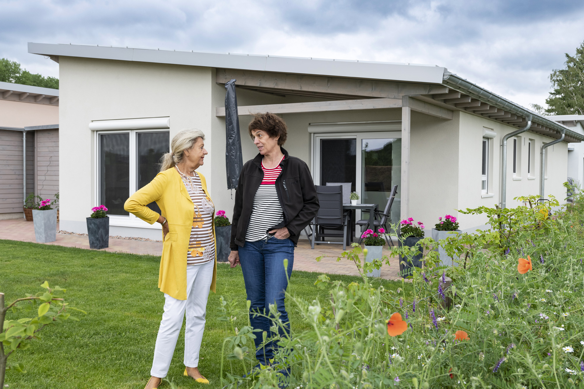 Die ebenerdigen, barrierearmen Bungalows haben unterschiedliche Größen. Jedes Haus hat einen eigenen Carport mit angrenzendem Außenabstellraum und eine überdachte, von zwei Hauswänden geschützte Terrasse.